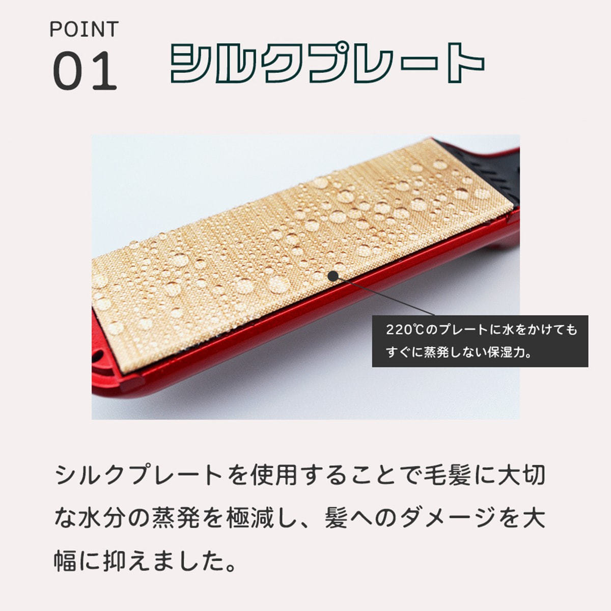テフロン系シートにより、プレートの金属表面が直接毛髪に触れない為、毛髪の金属焼け(炭化現象)が少なく、毛髪に大切な水分の蒸発を極減し、ダメージを大幅に抑えました。