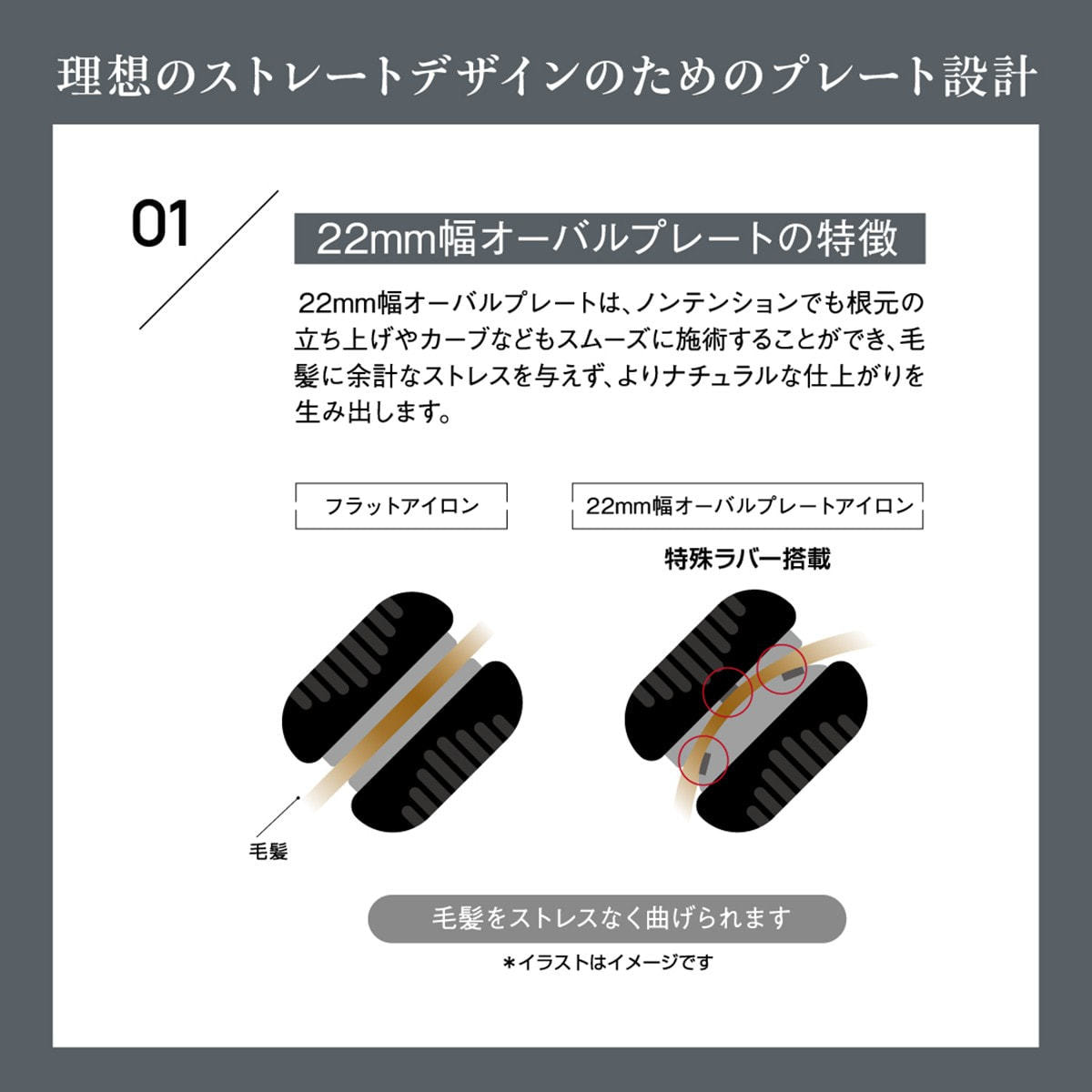22mm幅オーバルプレートにより、アイロンスタイリング時にナチュラルカーブや根元のボリュームをだすことができます。